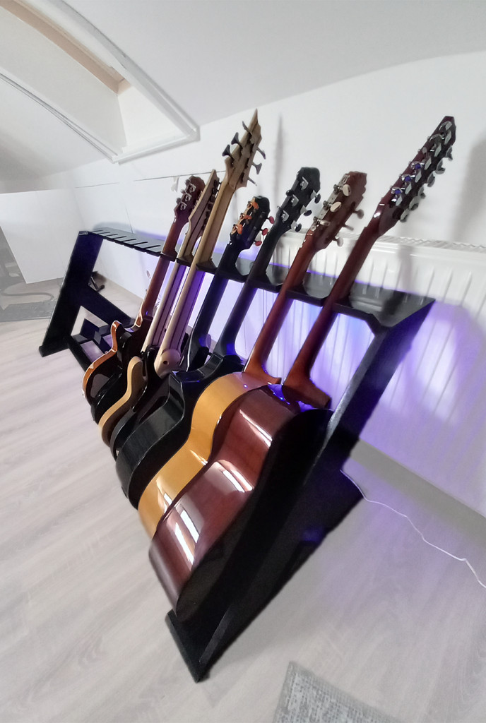 Ez a gitárállvány több színben és kivitelben is rendelhető, hogy a legjobban illeszkedjen a személyes stílushoz és környezethez. Továbbá, kérhető beépített LED világítással is, amely kiemeli a gitárok szépségét, és különleges hangulatot ad a térnek.
